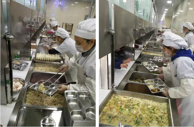 食堂從業(yè)人員全部持健康證上崗,上班時間統(tǒng)一規(guī)范著裝,所有人員佩戴工衣、工帽、口罩、圍裙,不得穿戴手表、飾物等。他們嚴格按照《餐飲服務食品安全操作規(guī)范》進行加工操作,做到食物燒熟煮透、生熟分開,嚴格落實用具分類制度,防止食物交叉污染。師生飯菜同時烹飪。