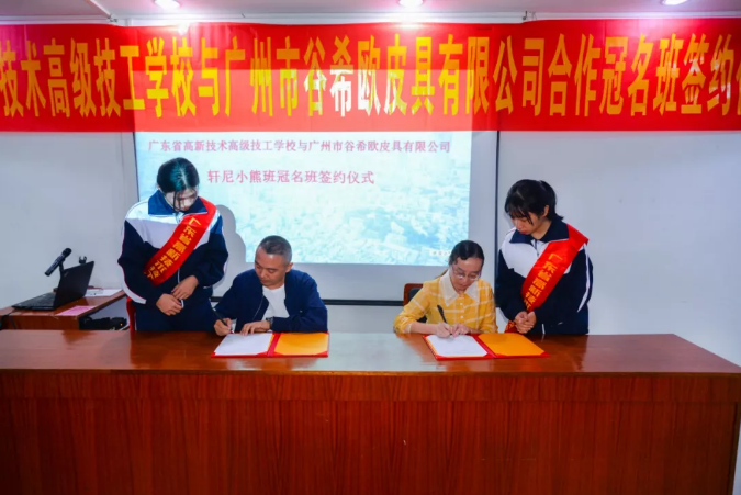 10月28日下午4:30,廣東省高新技術高級技工學校與廣州市谷希歐皮具有限公司合作冠名班簽約儀式于學校天培樓會議室舉行。