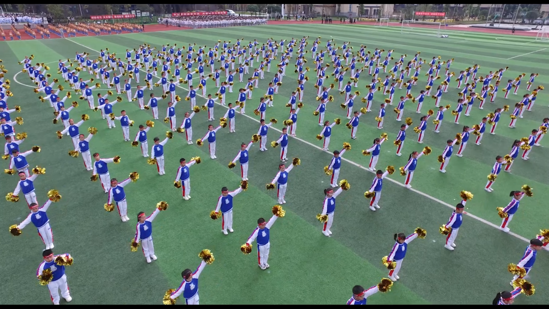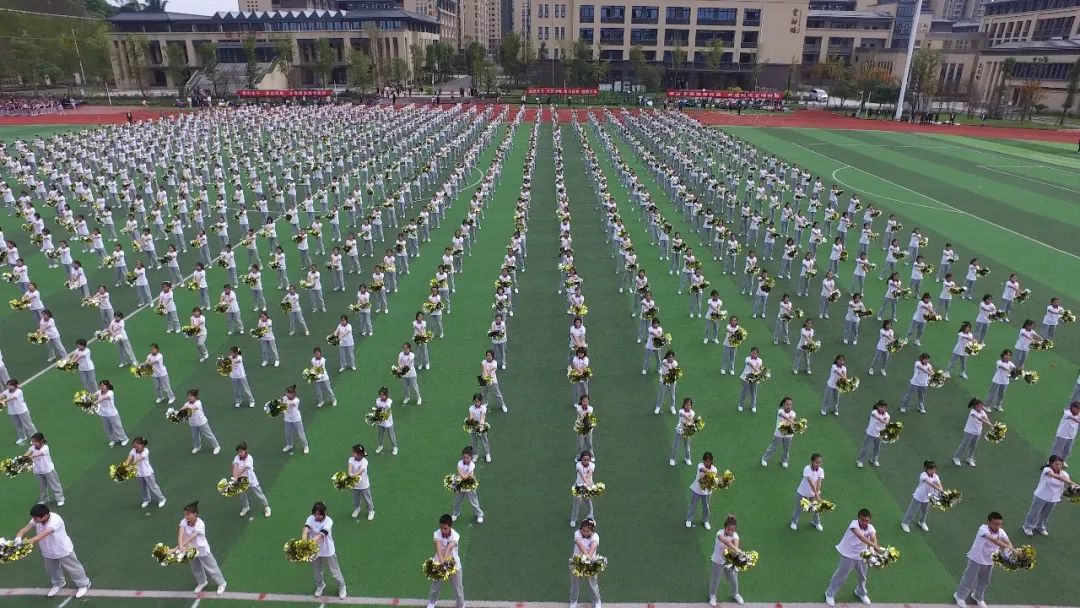 潔白的和平鴿應(yīng)聲而起飛向藍(lán)天,鼓樂隊奏響激昂的運(yùn)動員進(jìn)行曲,班旗方陣與彩旗方陣的百余名同學(xué)擎著代表班級榮譽(yù)的旗幟,帶起陣陣破風(fēng)之聲,這聲音不僅預(yù)示著運(yùn)動會的勝利開幕,更彰示著自貢衡川定將勢如破竹,走向更高的天空。初一、高一 花球啦啦操
