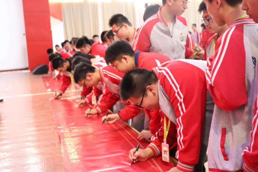 各班學生分別到臺前簽名,表達自己的雄心壯志,堅持砥礪前行。一個個形各異卻志相同的名字仿佛在無聲地宣告同學們必定將努力落實在行動上的決心。