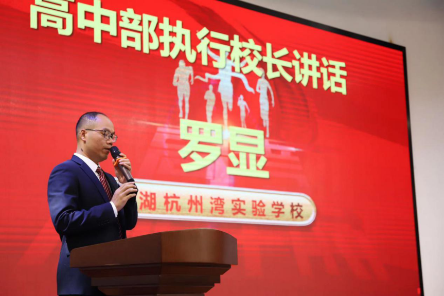 高中部執行校長羅顯發言,羅校長強調三點:一、堅定首考必勝的信念;二、嚴格按照計劃復習;三、每一個人都要竭盡全力。羅校長以獵狗和兔子的寓言故事告訴同學們盡力而為與竭盡全力的區別,激勵同學們要在首考竭盡全力,用拼搏決勝高考,提前奠定高考基石!